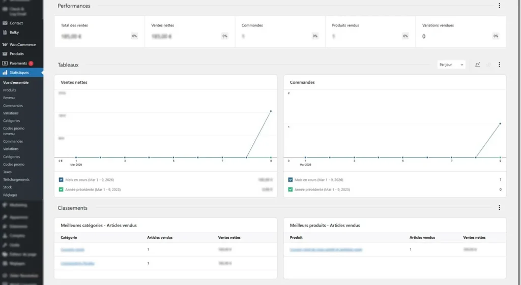 Un tableau de bord clair et visuel pour piloter votre activité. Plus besoin de croiser les fichiers : tout est centralisé dans votre back-office WordPress.