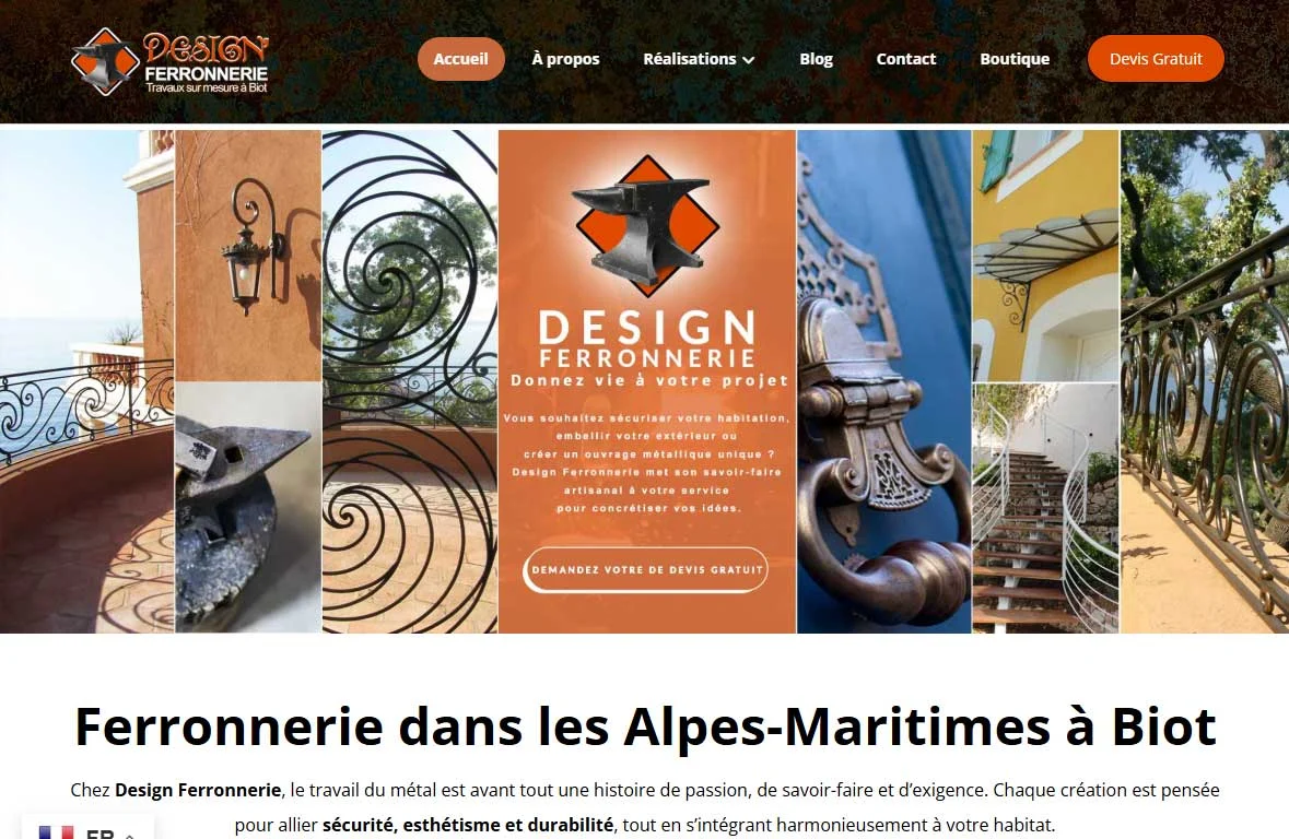 Un formulaire de demande de devis personnalisé a été intégré, permettant aux prospects de décrire leur projet avec précision dès le premier contact. Le site est optimisé pour le référencement local sur les requêtes artisan ferronnier Biot, ferronnerie d'art Alpes-Maritimes et ferronnerie sur mesure Côte d'Azur. Résultat : une visibilité significativement renforcée sur Google dans un rayon de 50 km autour de Biot.