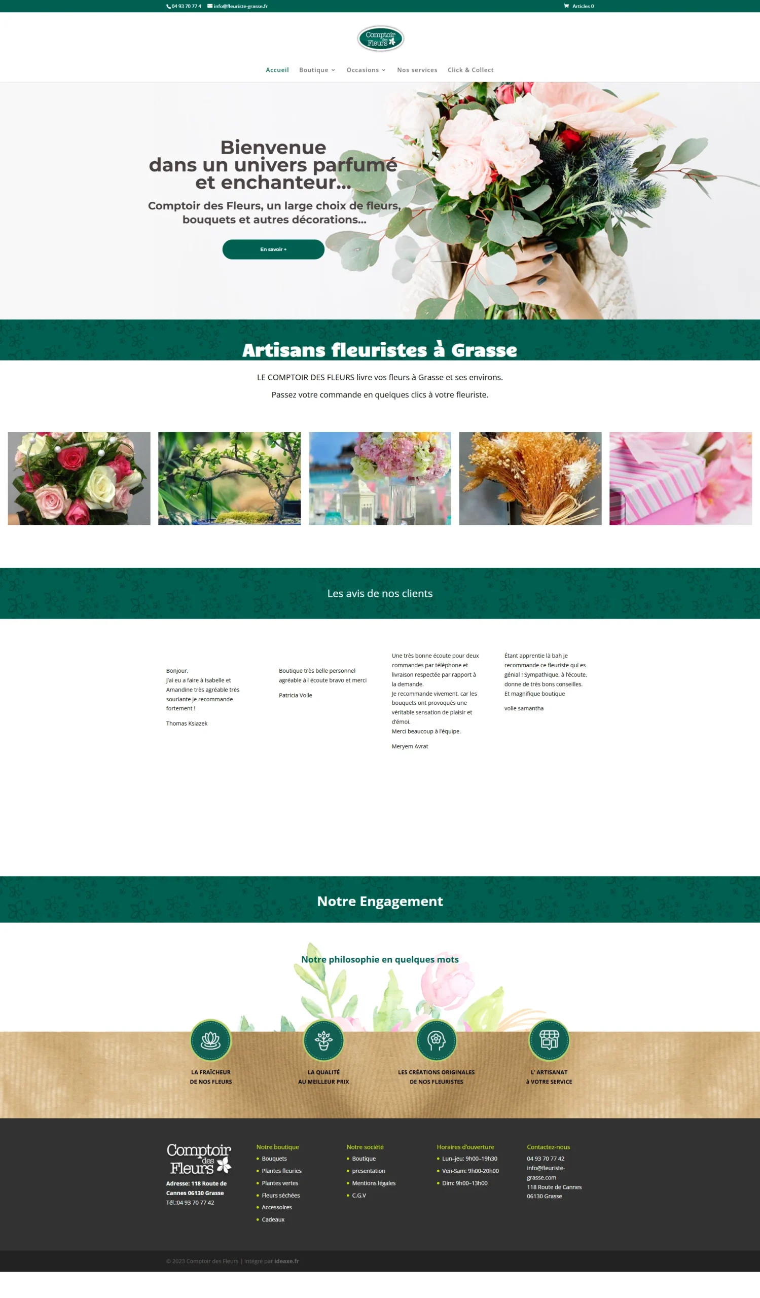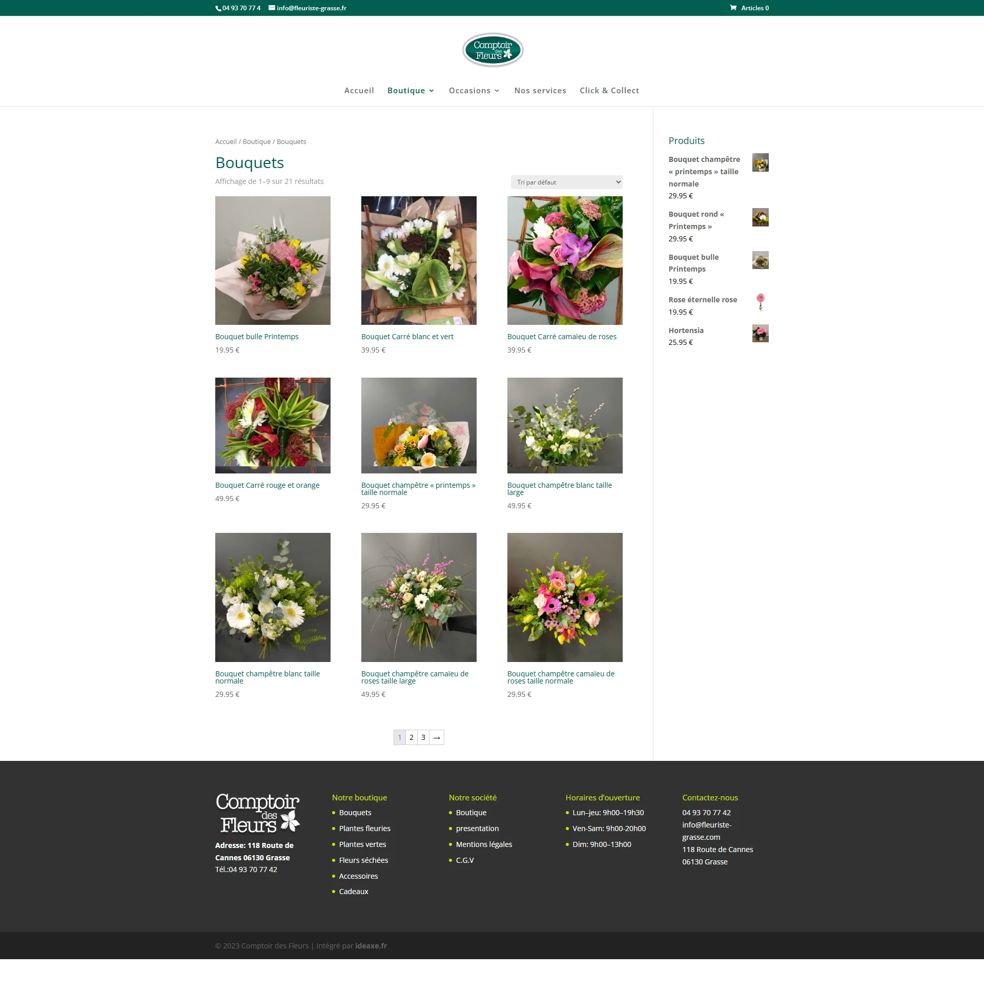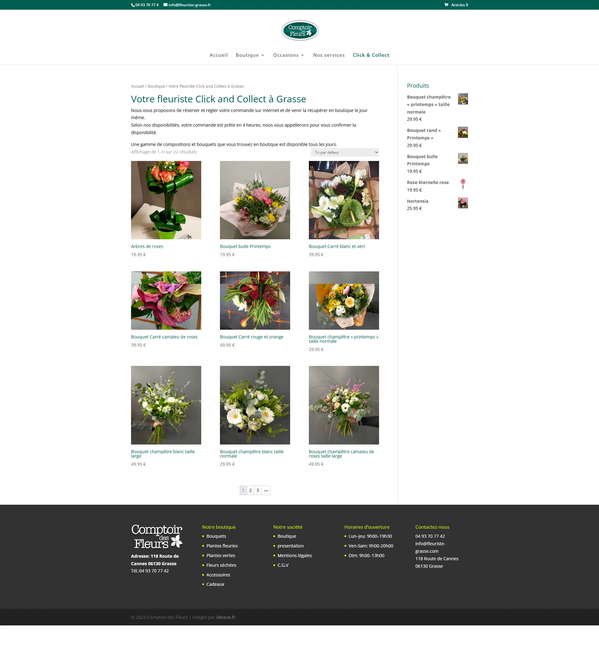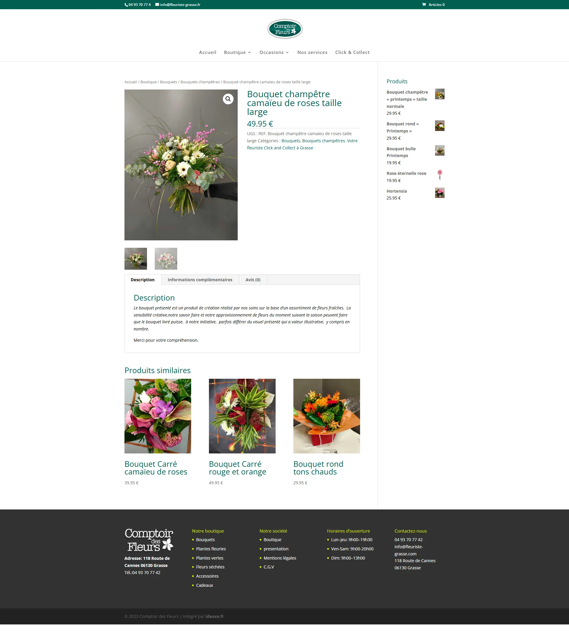 Ce fleuriste grassois souhaitait compléter son activité en boutique par une présence e-commerce permettant de prendre des commandes en ligne avec livraison à domicile et les communes environnantes. IDEAXE a développé une boutique WooCommerce élégante et fonctionnelle, parfaitement adaptée aux contraintes du métier de fleuriste.