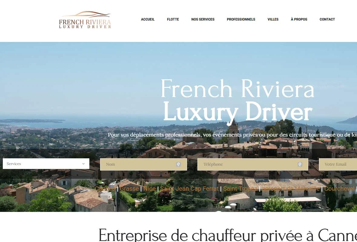 French Riviera Luxury Driver propose des services de chauffeur privé et de transport VTC haut de gamme sur toute la Côte d'Azur — aéroport de Nice, Monaco, Cannes, événements privés. IDEAXE a développé un site de prestige multilingue parfaitement aligné avec le positionnement premium de ce service.