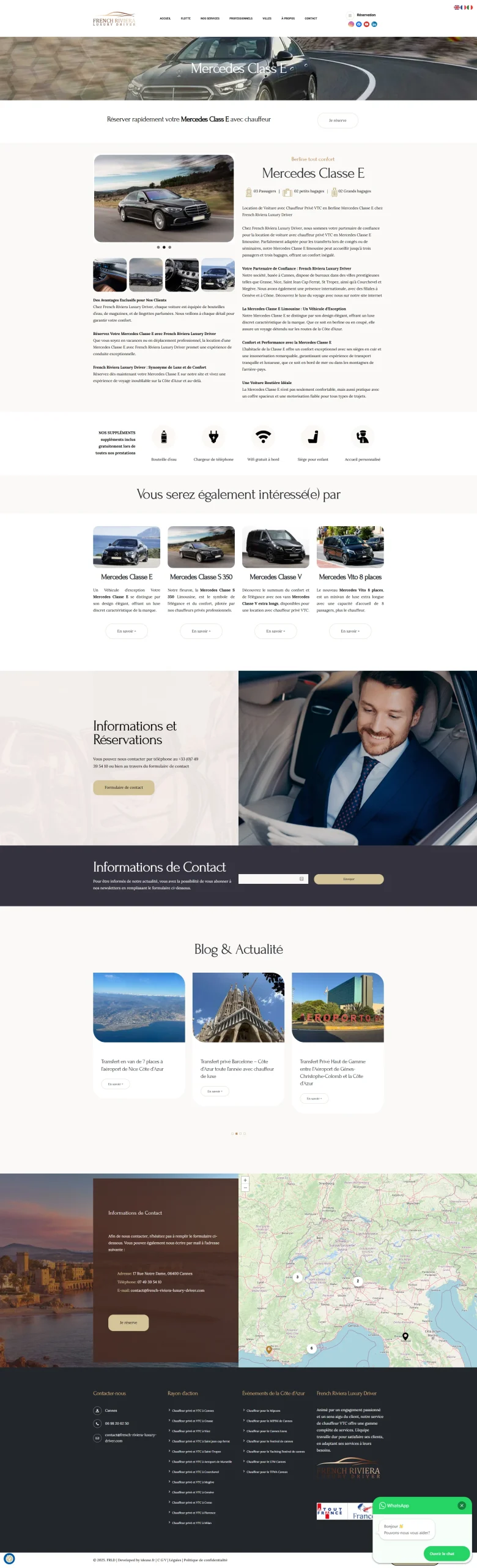 Le système de réservation en ligne permet aux clients de définir leur trajet, date, heure, nombre de passagers et de choisir leur véhicule parmi la flotte premium (Mercedes Classe S, Tesla Model S, van Mercedes). La tarification est affichée en euros, livres sterling et dollars selon la langue détectée. Le SEO international cible luxury driver French Riviera, chauffeur privé Nice Cannes Monaco et private driver Côte d'Azur en français, anglais et russe.