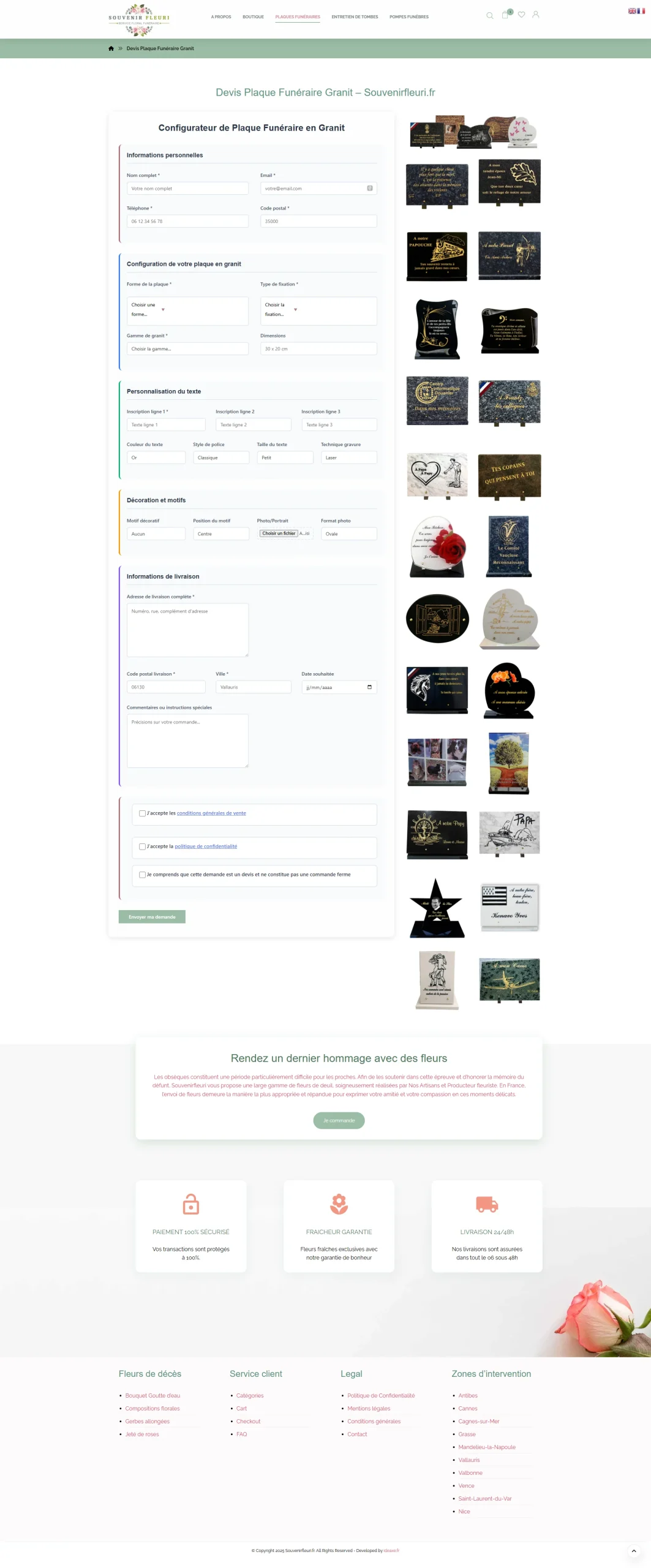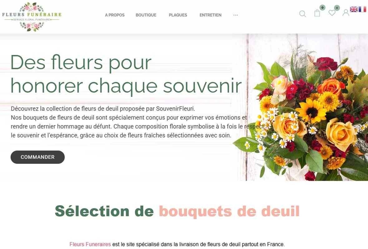 Souvenir Fleuri est une boutique en ligne spécialisée dans les fleurs de deuil avec livraison directement sur les cimetières. IDEAXE a développé cette plateforme e-commerce sur mesure, avec une attention particulière portée à l'expérience utilisateur dans un contexte émotionnellement sensible.